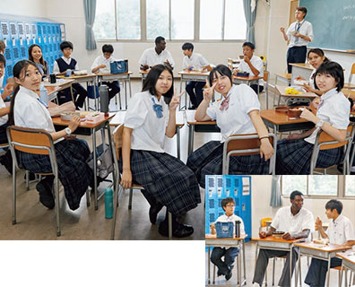 外国人教師や留学生たちと一緒に弁当を食べる「イングリッシュ・ランチ」、英会話に花が咲く。アフリカのガーナやフィリピンなど、多国籍の留学生たちと交流する生徒たち