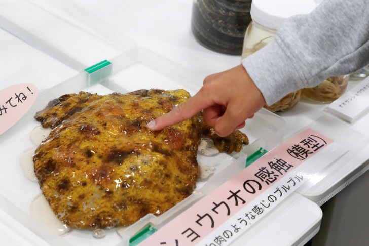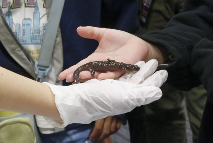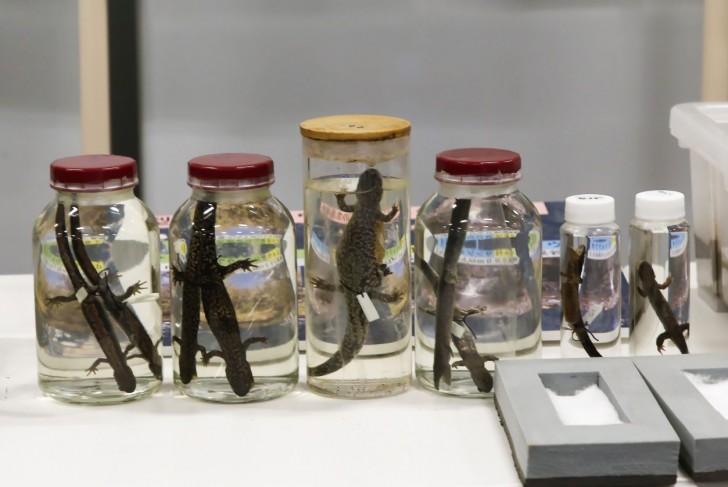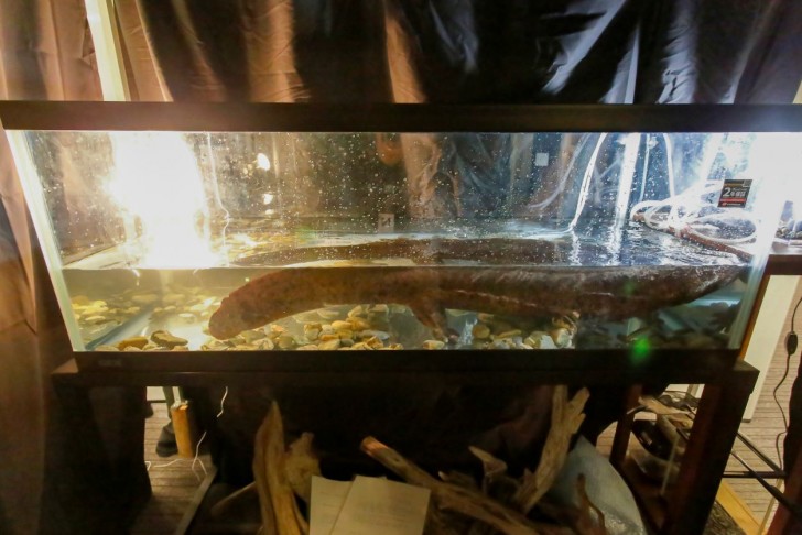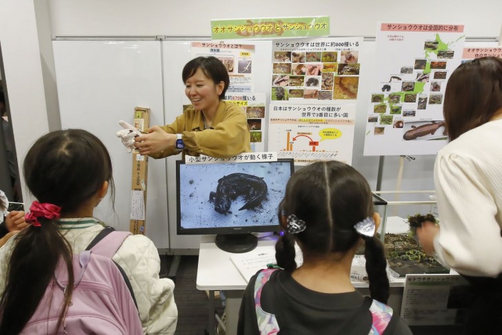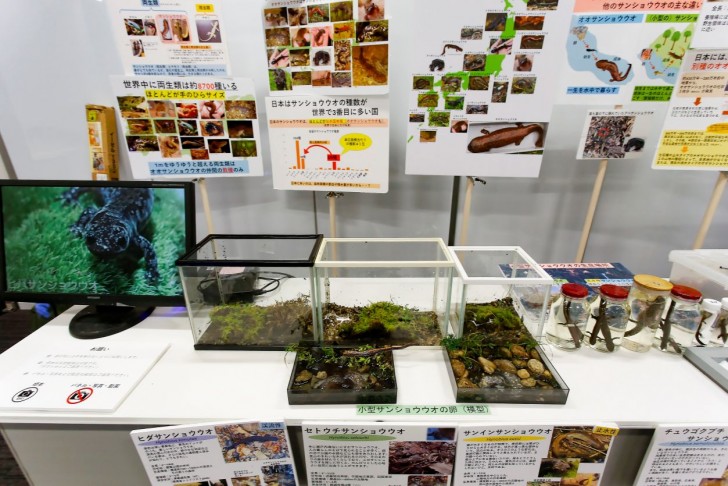 まずは日本有数のサンショウウオ研究機関である「日本ハンザキ研究所」による特別展示、「サンショウウオの生態展示」をご紹介します。研究所が誇る研究パネルや貴重な生き物標本に加え、生きたオオサンショウウオや小型サンショウウオ、淡水魚などの生き物たちも展示されました。小型サンショウウオに触れる機会なんて、そうそう無いですよね。これには大人・子ども双方から歓喜の声があがっていました。
