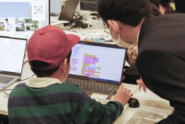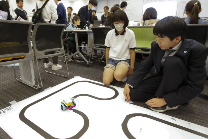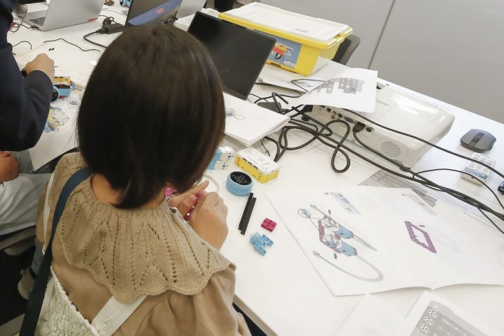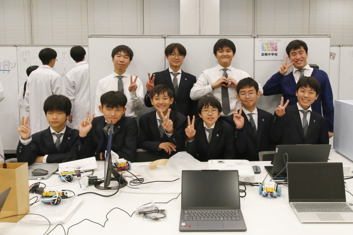 高槻では電気物理研究部が参加。学校での活動ではプログラミング、電子工作、ICT関連のスキルを日々高めています。まず、レゴを組み立てて車体をつくります。車体づくりも楽しそうですが、それをプログラミングして走らせるのはもっと楽しそう!小学生の保護者からも「これはこういうこと?」などの質問が出ると、在校生たちはきちんと説明。その人気ぶりにいつしかレゴやパソコンが足りないほどに。来年への課題ができました。