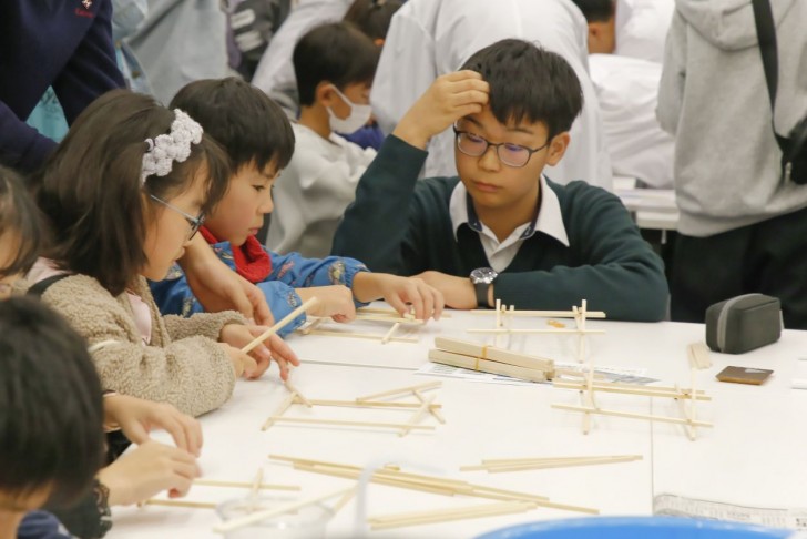 開明は物理部と化学部が参加。物理部では「ガウス加速器」「ダヴィンチの橋」、化学部では「水の電気分解」「信号反応」「ペーパークロマトグラフィー」実験を披露してくれました。信号反応実験では試験管の水が信号機の色のように変わる様子が観察できます。ダヴィンチの橋では釘や接着剤を使わずに、割りばしで組み立てた橋が自立し、強度を持つ仕組みを学びます。日常生活のなかにもある物理・化学の不思議、その面白さが少しでも小学生たちに伝わりますように。