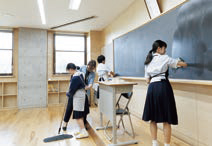 終礼後には丹念に清掃を行う。先生も生徒と同じようにエプロンを着用。