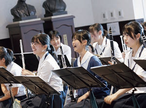 講堂のホワイエで練習する管弦楽部の面々。ヨハン・シュトラウス二世の「チク・タク・ポルカ」を軽快に演奏する。楽しんで取り組んでいるのがよくわかる