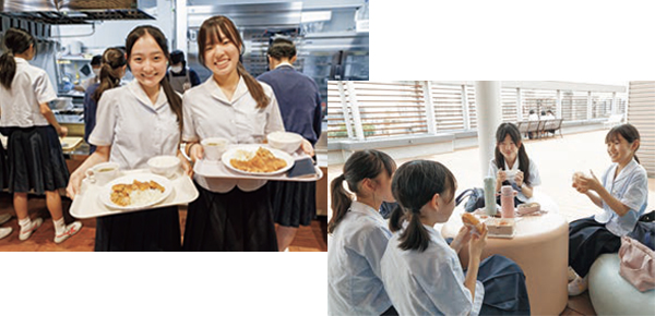 同じ敷地内にある小学校の児童も使用する食堂。約450人収容できるとか。生徒たちだけでなく教職員の利用率が高いのも、味・ボリューム・オシャレ感という「三方よし」のメニューだからこそ。時にはパスタやグラタンなども登場。取材の日の日替わりプレートはローストンカツ定食でした。教室はもちろん、屋上テラスでお弁当を食べる生徒の姿も見られます。