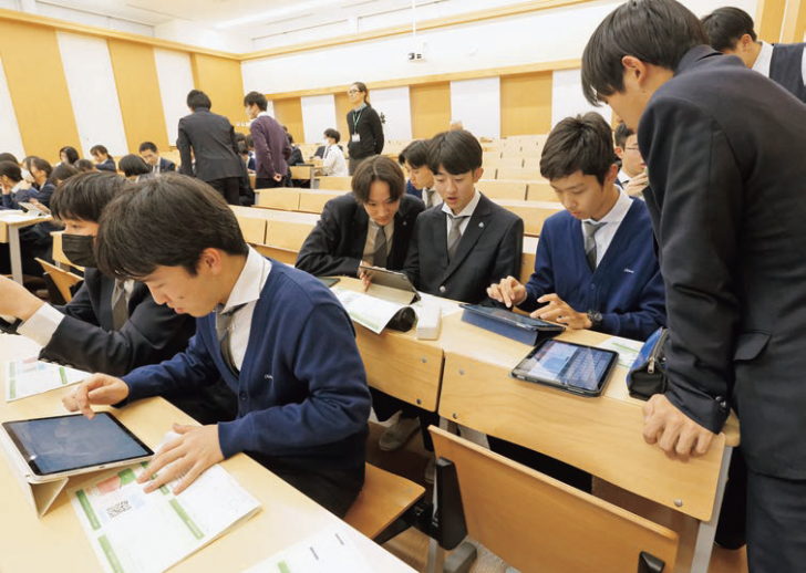 中3からは英語と思考力を軸とした「GL(グローバルリーダー)」、理科の課題研究が中心となる「GS(グローバルサイエンス)」、国際問題を英語で研究する「GA(グローバルアドバンスト)」という3つのコースに分かれる。写真は、グローバルセミナールームで行われていた高2「理数探究」の授業の様子。研究データを保存する「デジタル・ポートフォリオ」を作成する。北海道大学や京都大学の先生や大学院生たちが生徒たちを指導する。