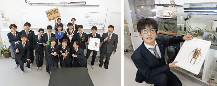 魚類に両生類、爬虫類など多様な生きものを飼育する生物部。水槽にはなんと高級食材のイセエビまでいるから驚かされる。脱皮した抜け殻を標本にする部員もあり、みんな和気あいあいとしているのが最高。せっかくなのでみんなで集合写真を。顧問を務めるのは取材中、校内を案内していただいた渉外・中学入試部長の神田宮壱先生。