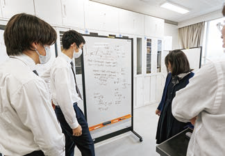 物理教室でホワイトボードに数式を書き込みながら議論をしているのは、2コマ連続で行われる高2「理数探究」を受講する生徒たち。時折、担当の先生に助言をもらいながらどんどん思考を深めていく姿は、科学者を見ているかのようだ。
