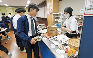食堂では通常メニューだけでなく、数種類のお弁当や丼、総菜パンなどテイクアウトメニューも充実。生徒はもちろん教職員の利用率も高い。この日の日替定食(500円)は白身魚フライとカレーコロッケ盛り。リニューアル後の食堂をお楽しみに。