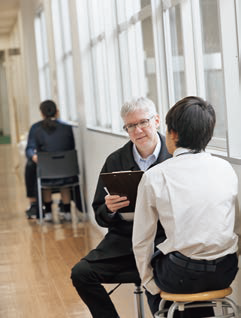 廊下に出て一人ずつスピーキングのテストが行われていたのは中2「英語」、ダニエル先生をはじめベルリッツ所属の外国人教師が授業を担当。